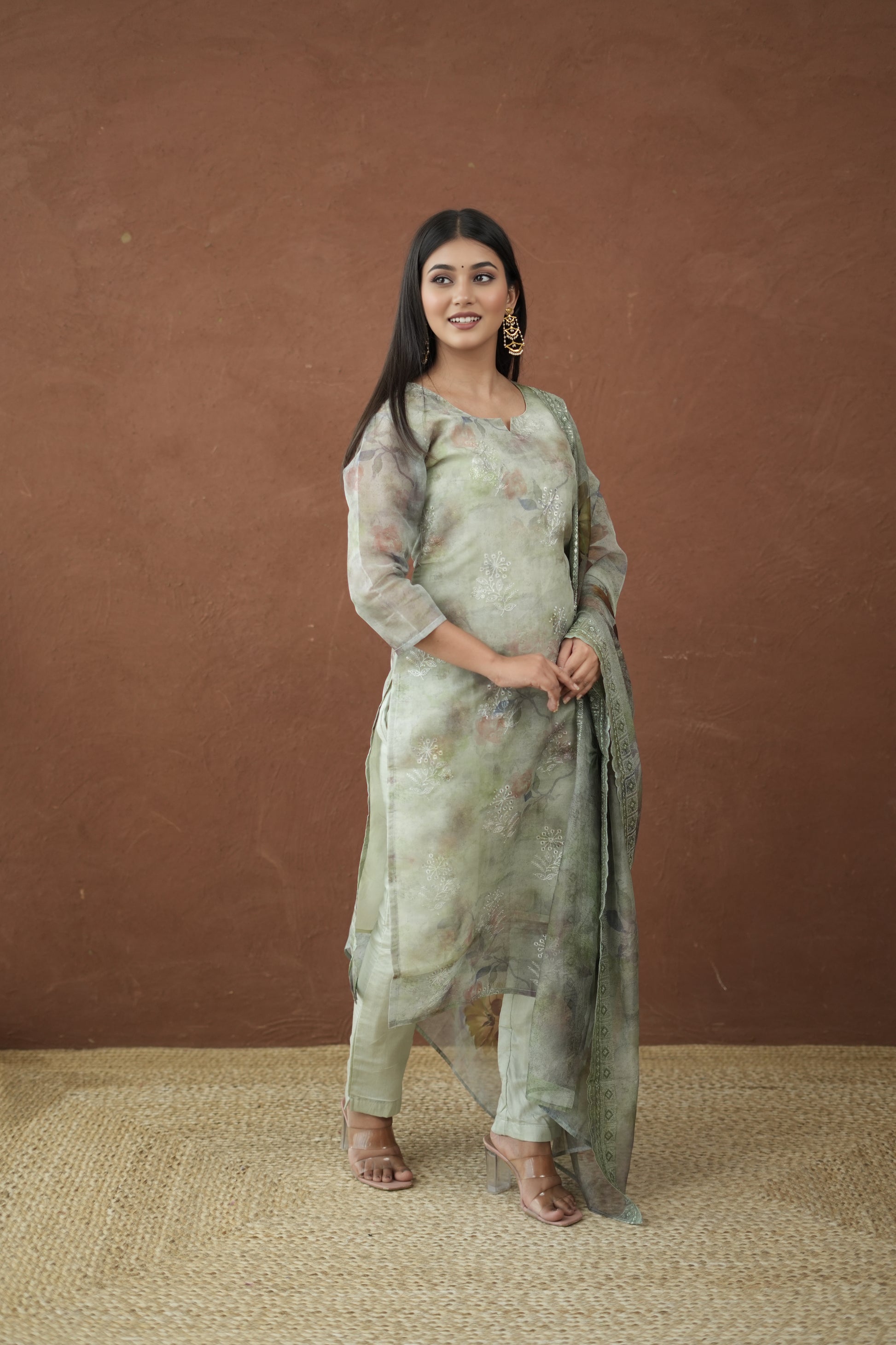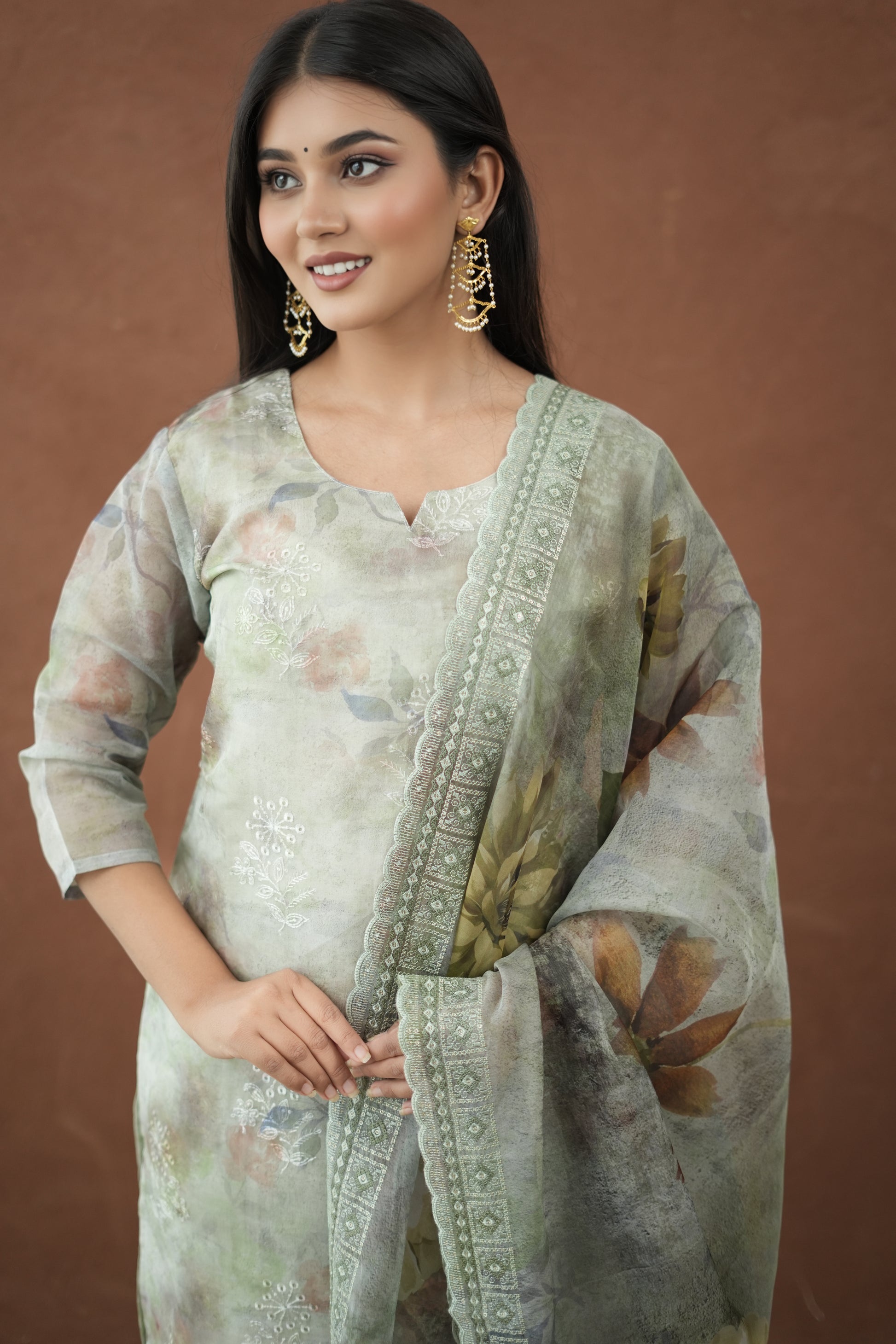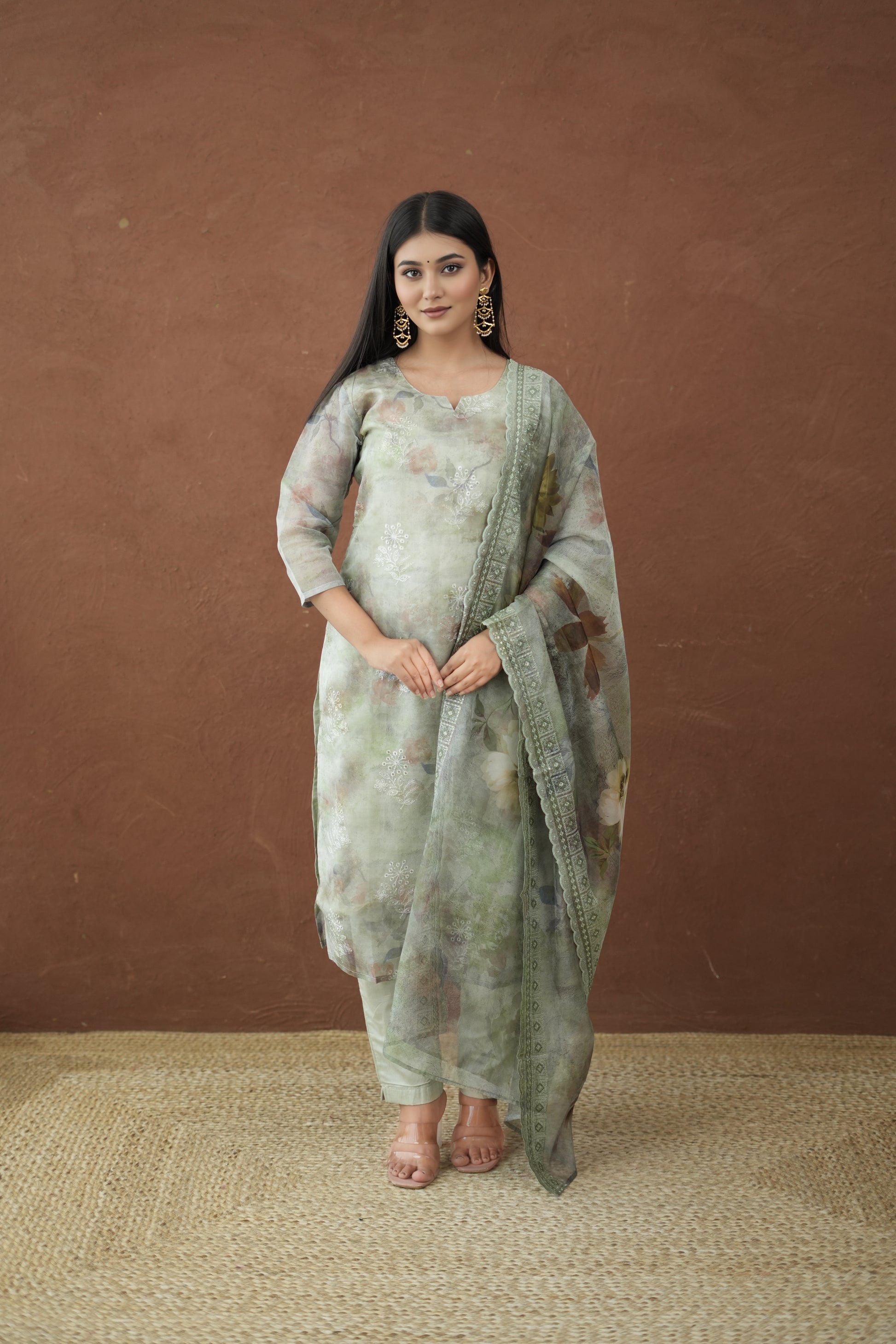Experience the perfect blend of elegance and comfort with the Green Digital Print Noorani Charm Viscose Set. The kurta is crafted from delicate Viscose Orjanza Silk, enhanced with a soft Mulmul cotton lining for breathable, lightweight comfort. Paired beautifully with a flowing Viscose Upada Silk bottom, this ensemble offers a sophisticated drape and effortless style.