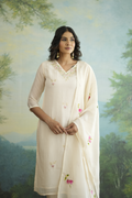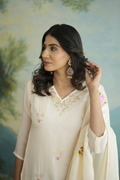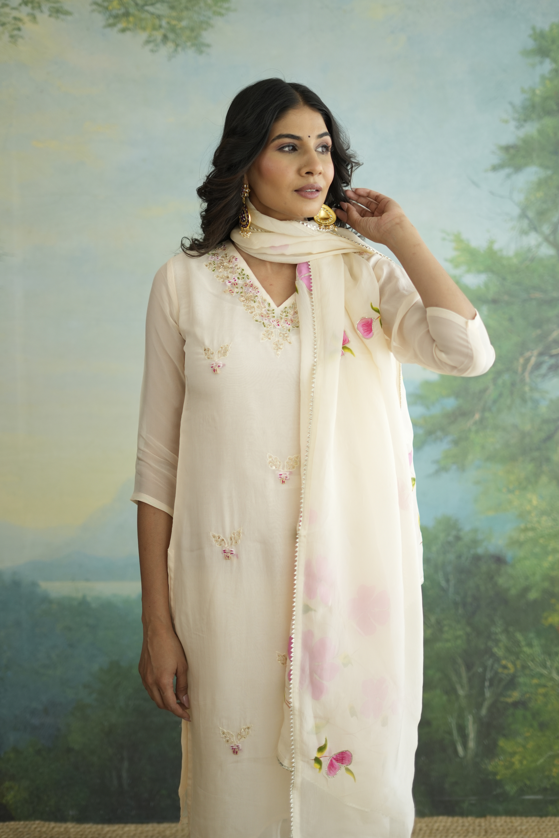 Unfold the elegance of handcrafted beauty with the Gulnaar Hand-Painted Orjanza Set. The top and dupatta are made from soft, sheer Viscose Orjanza, lending a dreamy, flowy charm to the silhouette. The dupatta features exquisite hand brush painting and delicate gotta work, adding a personal, artisanal touch to every piece.Paired with a smooth Santoon Silk pant, this ensemble brings together tradition and grace in perfect harmony.