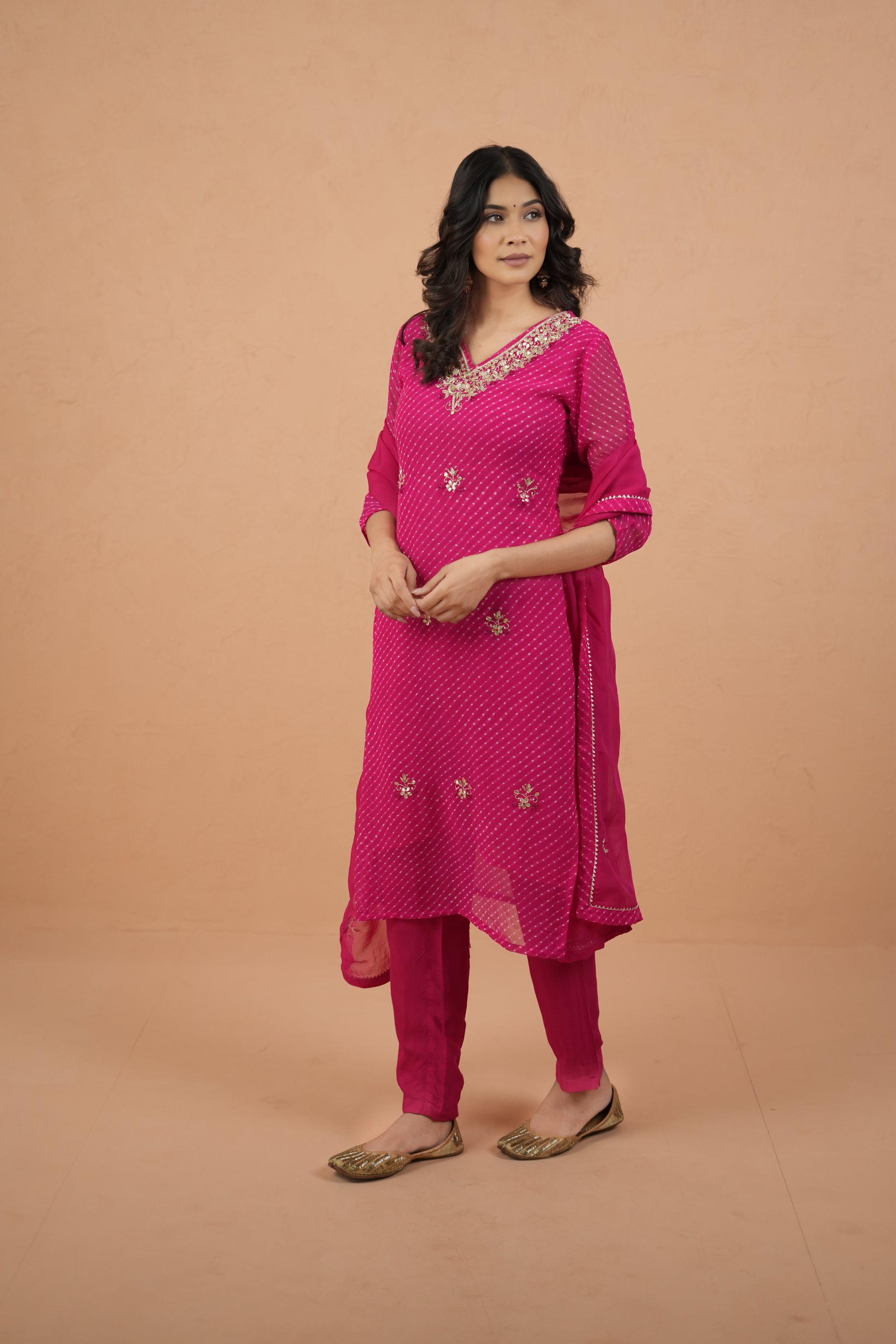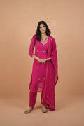 Unveil a blend of grace and craftsmanship with the Mothra Muse Handcrafted Suit Set. The kurti is fashioned from flowy Georgette Mothra Silk, offering a light, airy drape with subtle texture and charm. Paired with soft and comfortable Santoon Silk pants, the set ensures both elegance and ease of movement.