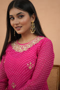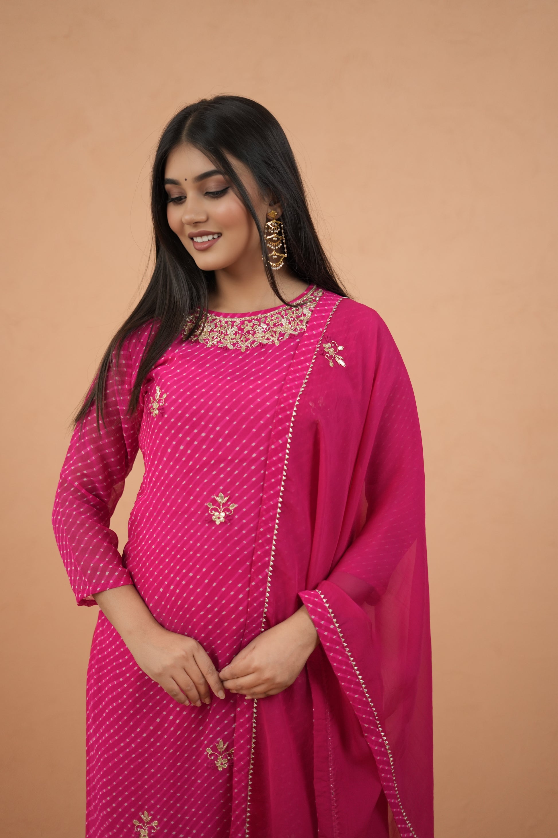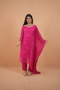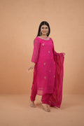 The kurti and the pants are made from flowy Mothra Georgette, offering a graceful fall and ethereal movement. The highlight is the Viscose Organza Silk Dupatta, delicately bordered with intricate Bija work, adding a regal touch to the look.