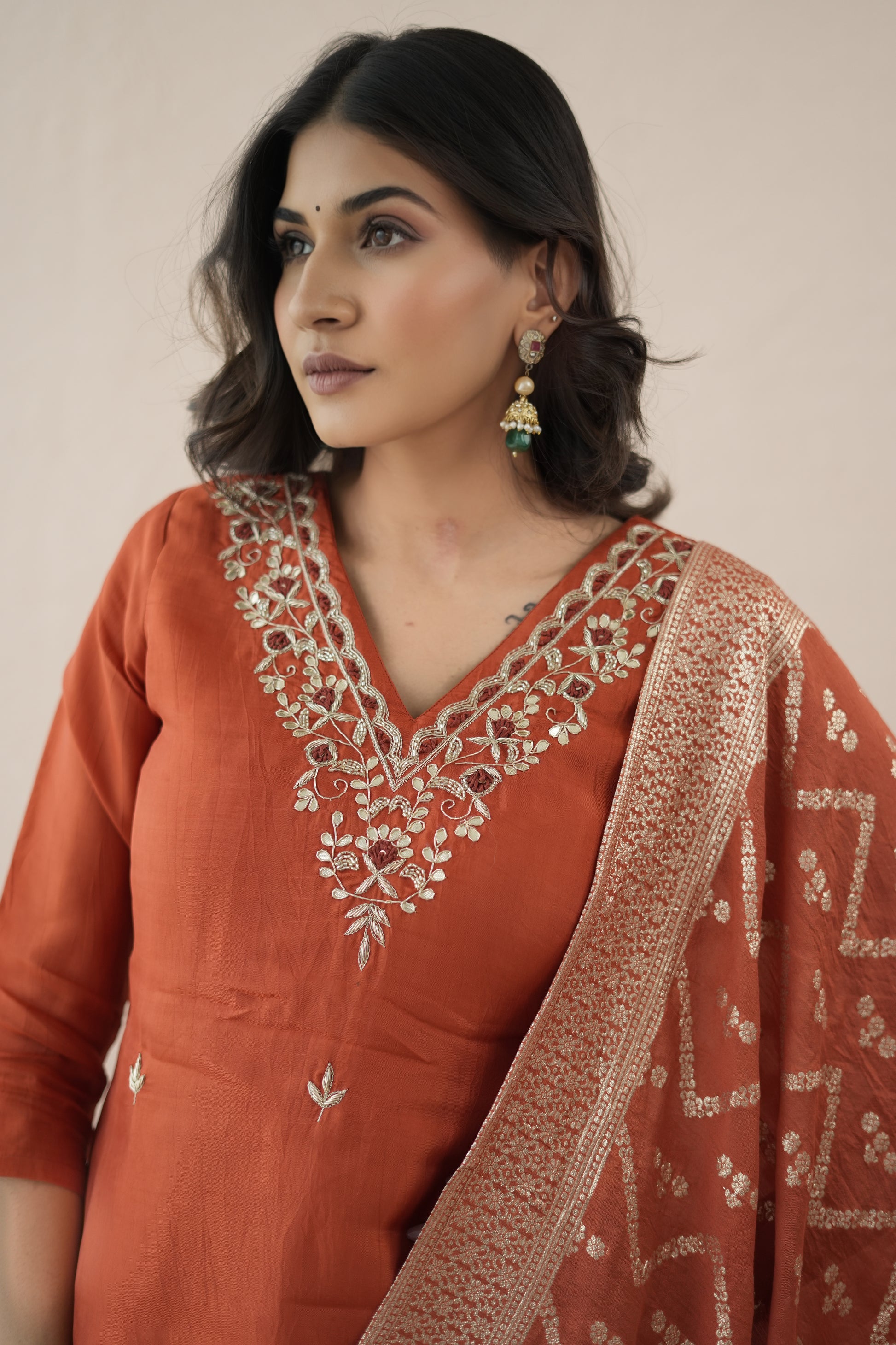Gracefully traditional and luxuriously crafted, the Zari Silk Royale Suit Set is a timeless ensemble for the modern woman with a love for elegance. The Kurti is made from premium Upada Silk, known for its soft texture and rich finish, while the bottom is tailored in smooth Santoon Silk, ensuring comfort with a chic drape. Completing the look is a stunning Zari Silk Dupatta, delicately woven with traditional charm and a hint of shimmer for that regal touch.