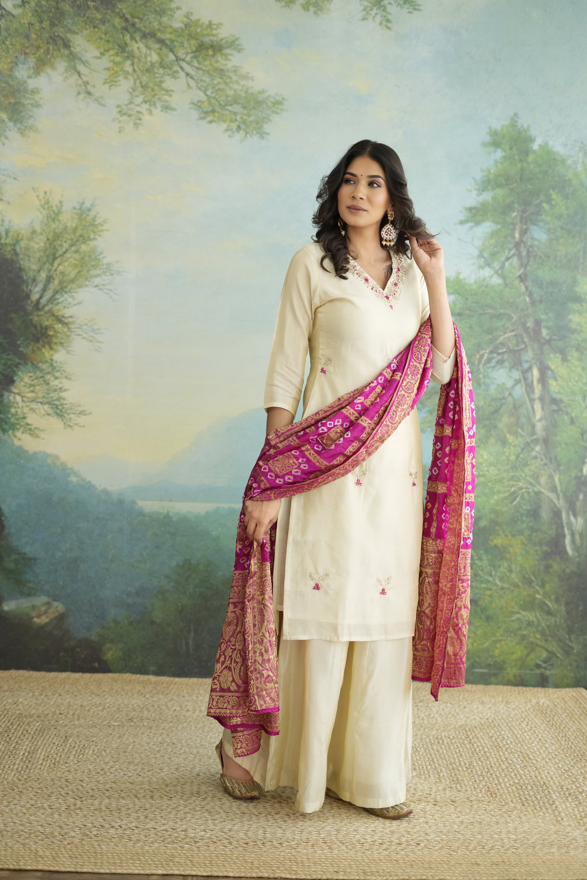 Pink Bandhej Zari Bandh Tissue Silk Kurti And Palazo Suit Set